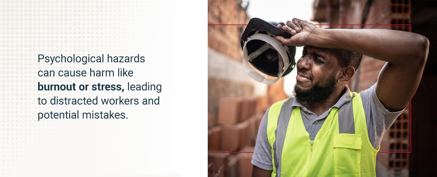 Psychological hazards can cause harm like burnout or stress, leading to distracted workers and potential mistakes. To combat the causes of psychological harm, managers and supervisors can implement a positive workplace culture that values safety, equality and sustainable working practices.