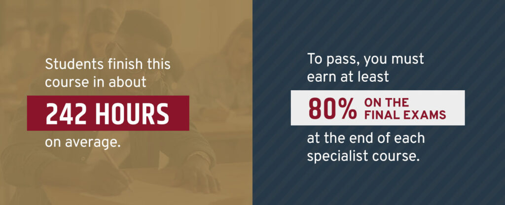 During the certificate program, you learn at your own pace, and you have six months to complete the online courses. Students finish this course in about 242 hours on average and will receive 24.2 CEUs that can be transferred to academic credits through our Partners at Columbia Southern University. To pass, you must earn at least 80% on the final exams at the end of each specialist course. You can attempt each exam twice. While the exams aren’t timed, you must complete each in one session, so be sure to give yourself plenty of time since leaving early will count as a failed attempt. After five to 10 business days, we’ll mail your certificate.